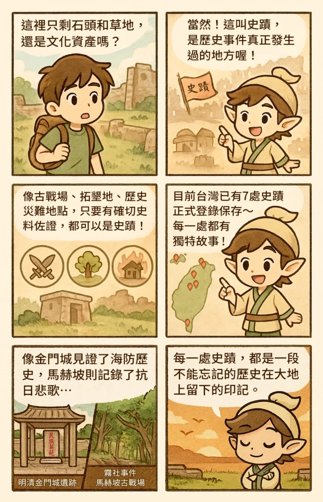 史蹟是指因歷史事件而定著,具有歷史、文化、藝術價值的重要空間與附屬設施,如古戰場、拓墾地、災難地點等。